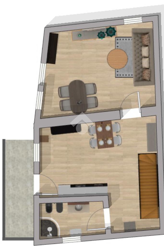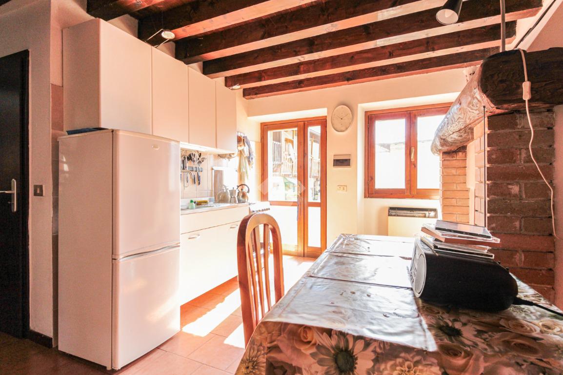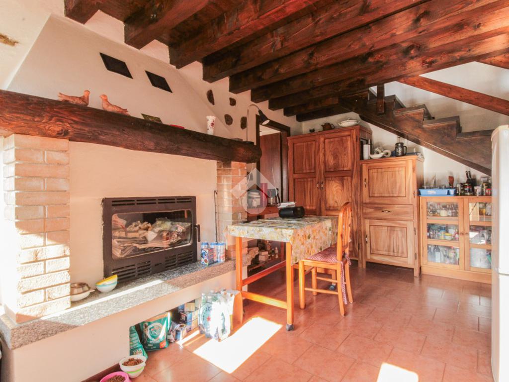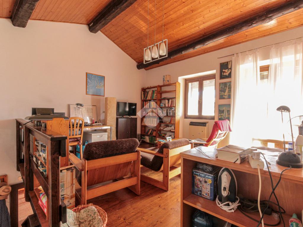 Salendo le scale esterne raggiungiamo un balcone che fa da ingresso alla casa, entrando ci troviamo nella cucina abitabile con camino, sulla sinistra troviamo la zona giorno e sulla destra un bagno con doccia.