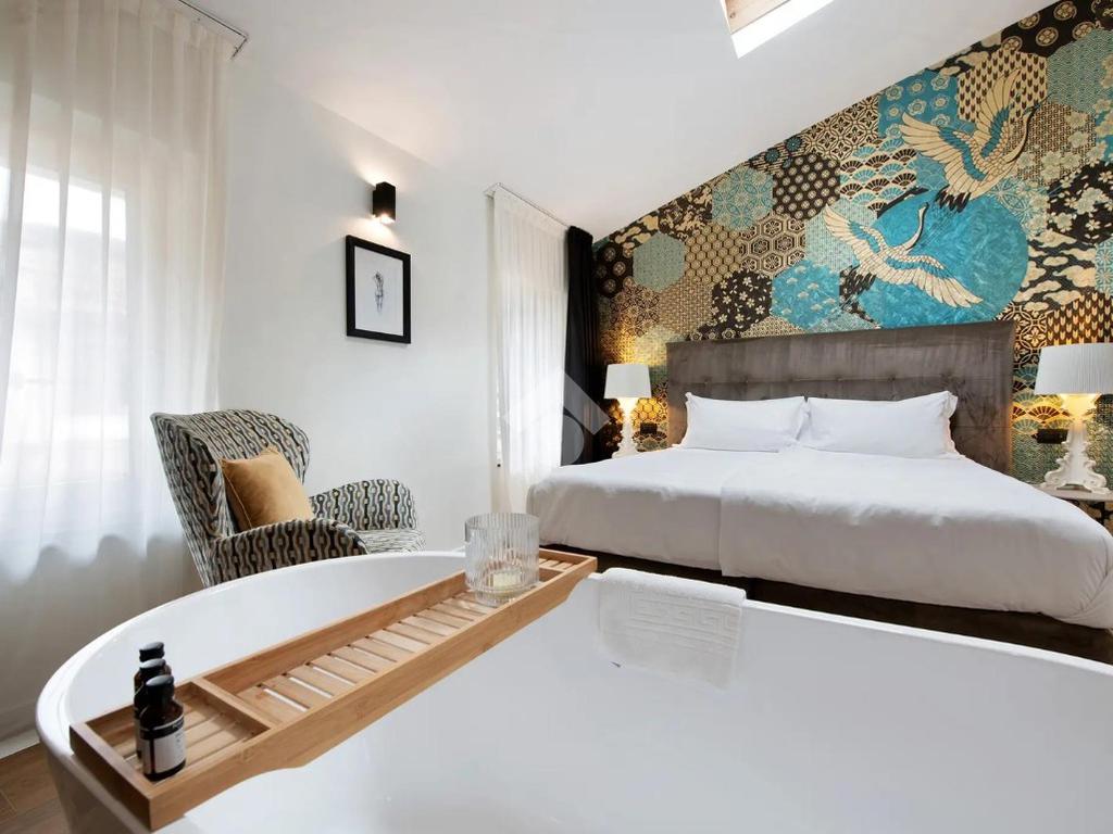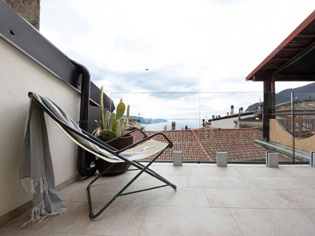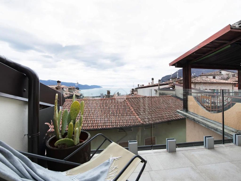 It consists of a bright living area with kitchenette and access to a private terrace with lake view, double bedroom with bathtub, and bathroom with shower.