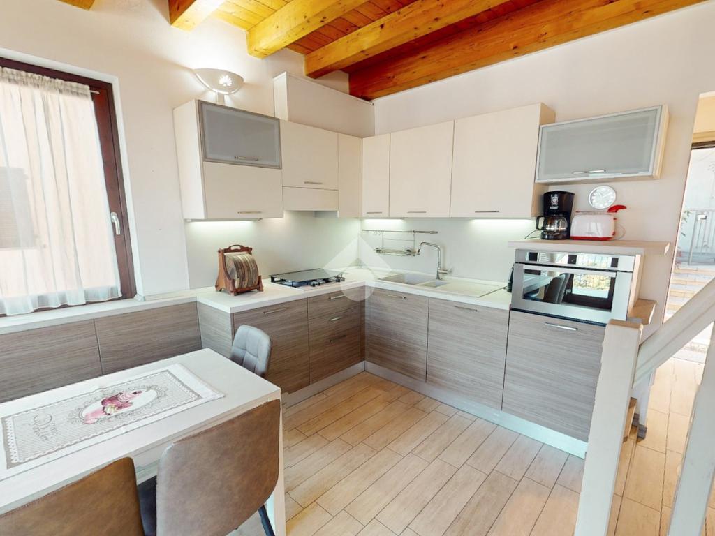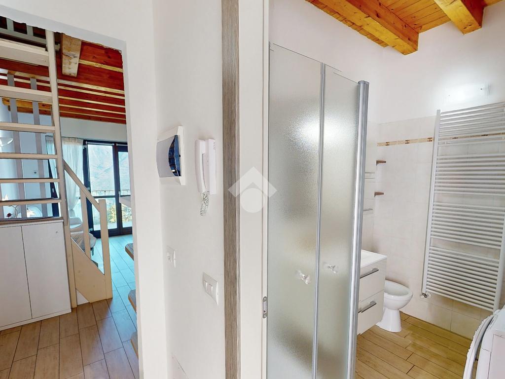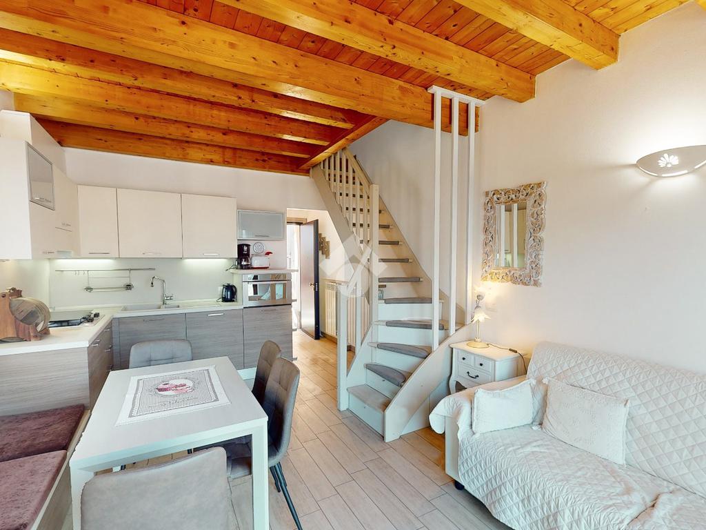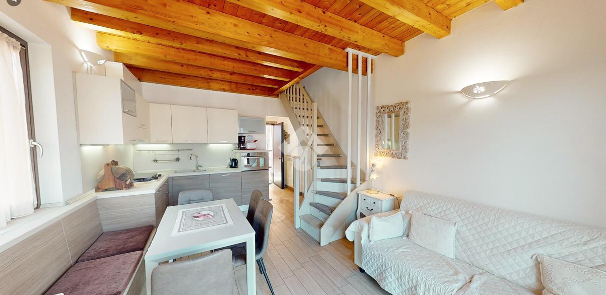 The property, spread over two floors, consists of a living area with open-plan kitchen, bathroom with shower, and terrace with panoramic lake views. Climbing the wooden stairs leads to the attic sleeping area with double bedroom and a second bathroom complete with sanitary fixtures.