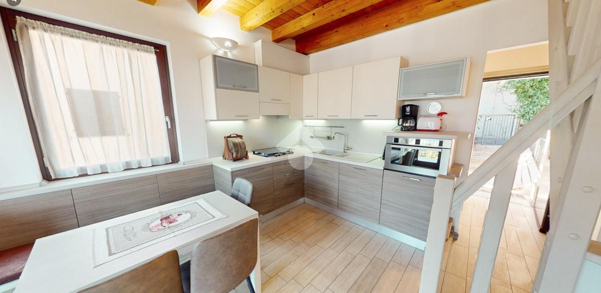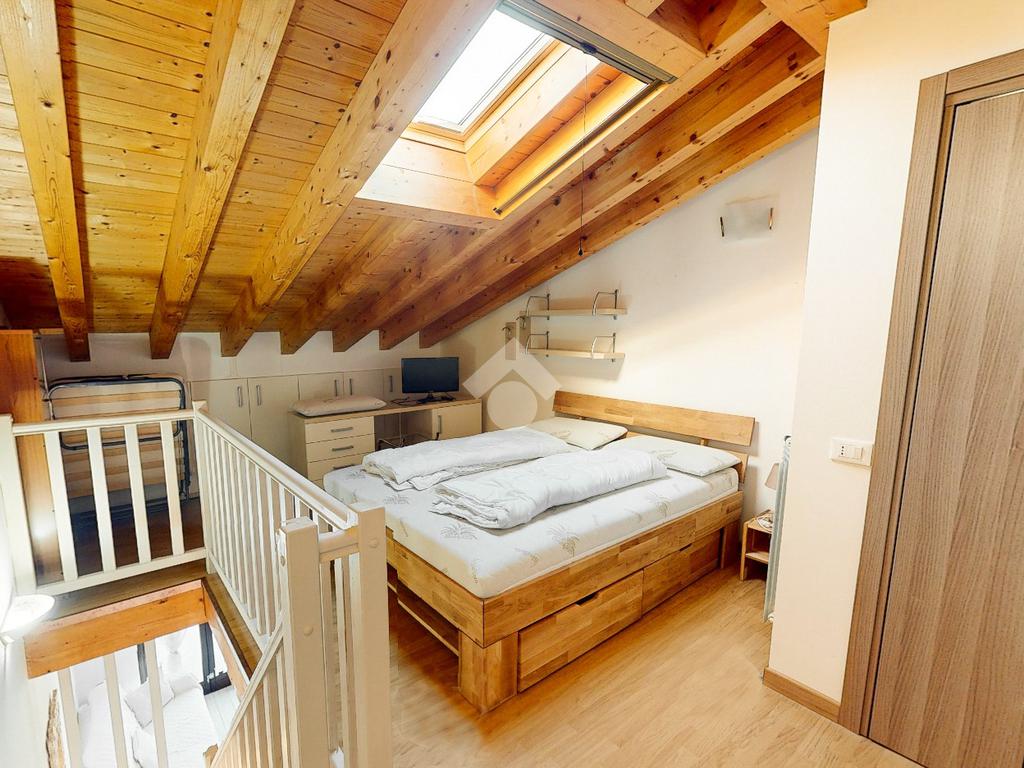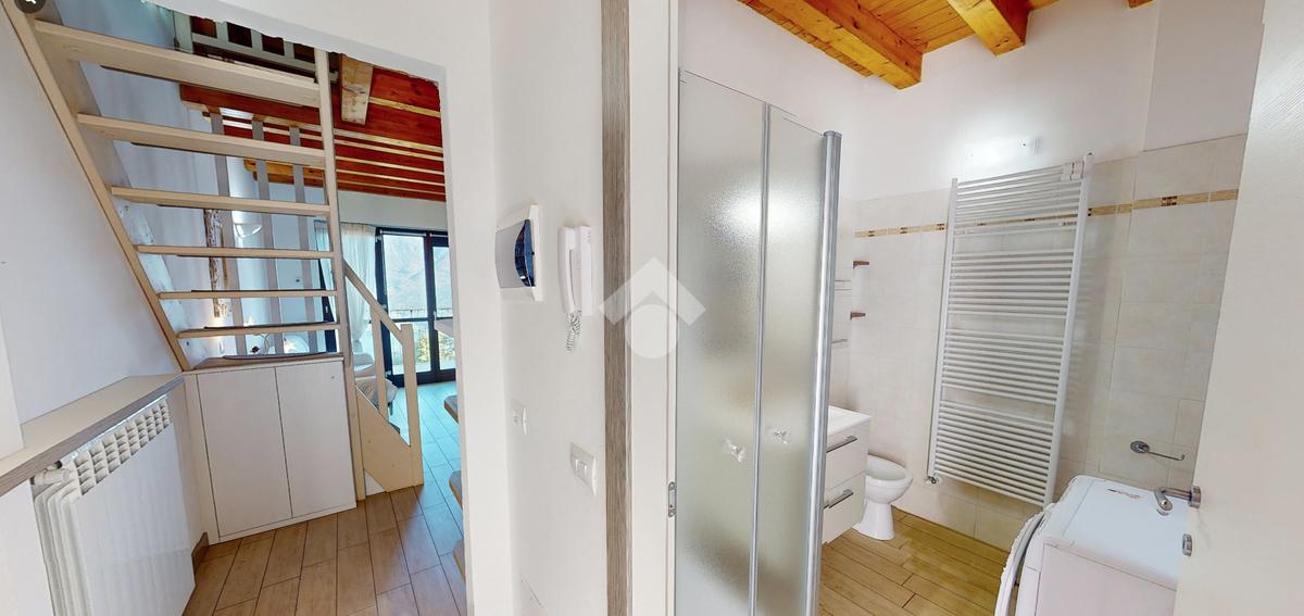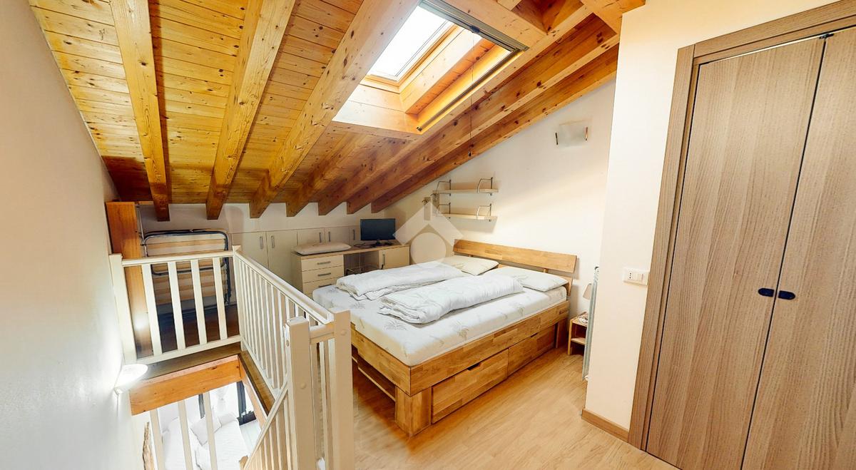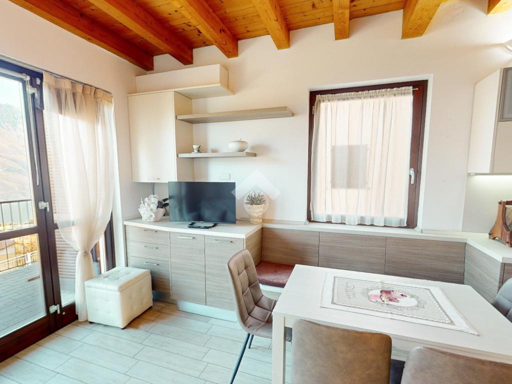 The property, spread over two floors, consists of a living area with open-plan kitchen, bathroom with shower, and terrace with panoramic lake views. Climbing the wooden stairs leads to the attic sleeping area with double bedroom and a second bathroom complete with sanitary fixtures.